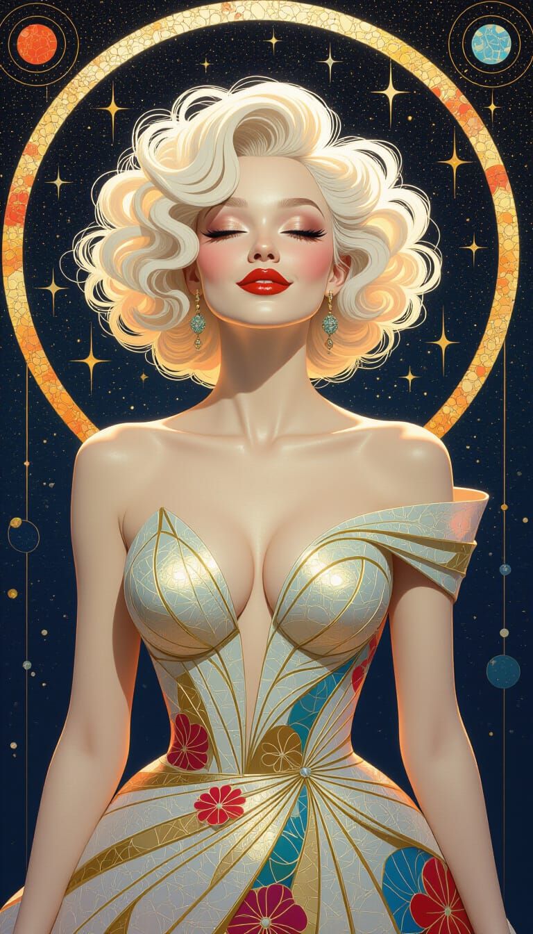 This image shows an elegant albino woman surrounded by futuristic glowing forms. The digital art uses bioluminescence, stardust effects and hyperdetailed elements in a Klimt-inspired style.