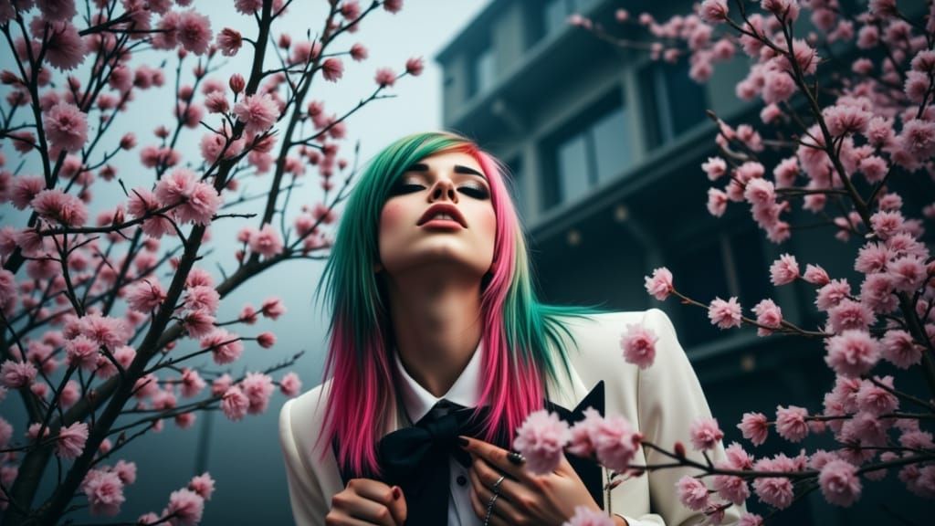 A real photo of a beautiful emo woman with pink and green hair <lora:XxBEAUTIFYxX:1.0> wearing a white tuxedo and pants with cherry blossom designs singing emotionally and passionately in a metalcore song in a misty white foggy place with cherry blossoms everywhere clutches the microphone with her band ...