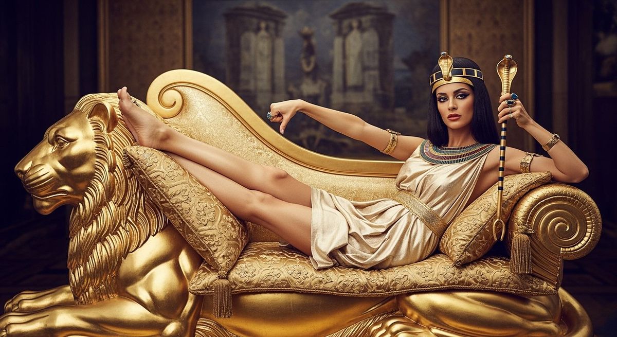 A captivating image shows an Egyptian queen relaxing on a golden chaise lounge. The photo features shallow depth of field and natural lighting, creating a visually stunning composition reminiscent of high-end fashion photography.