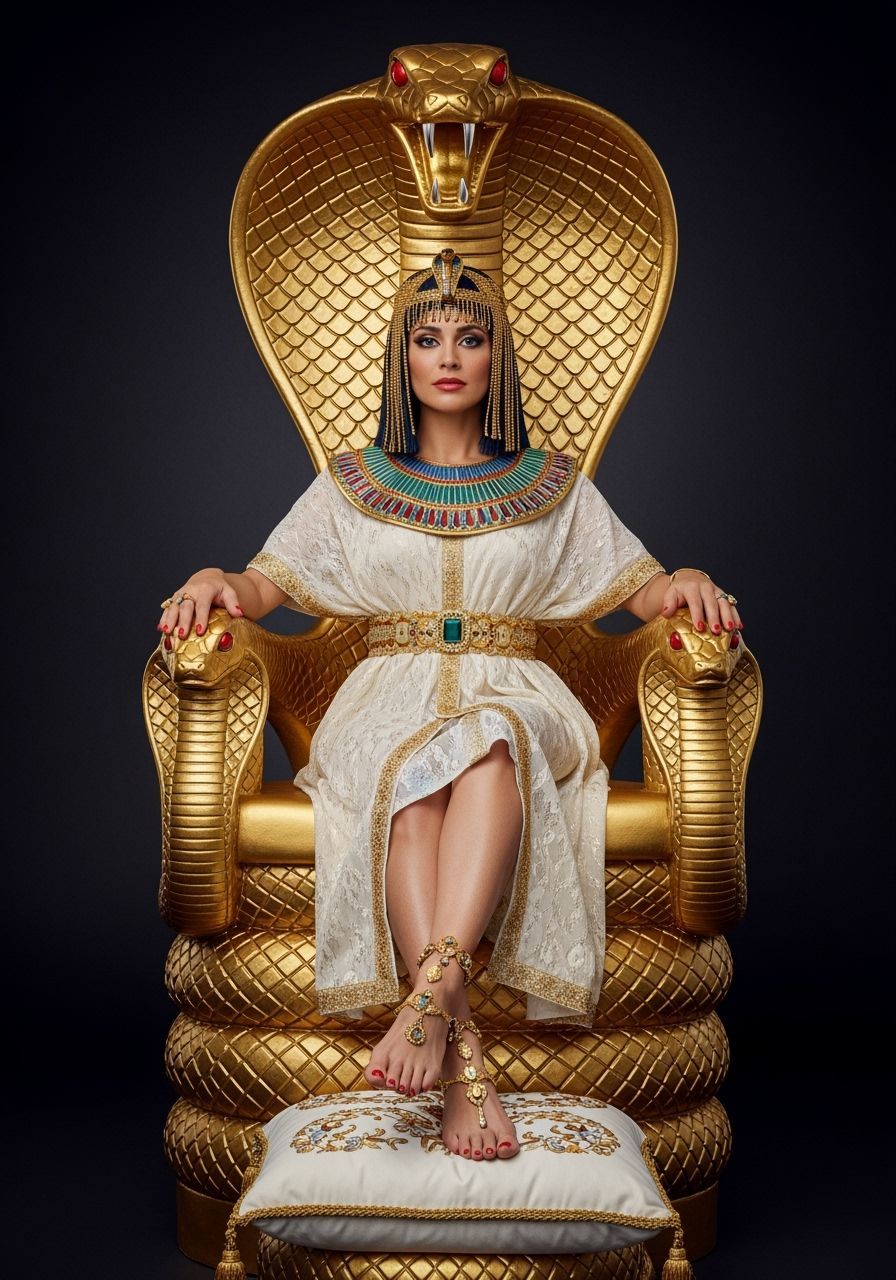This image shows an Egyptian queen on a golden throne shaped like a cobra. She wears a gold and emerald toga with matching jewelry, and her feet rest on a white pillow. The image has a sharp focus and natural lighting.