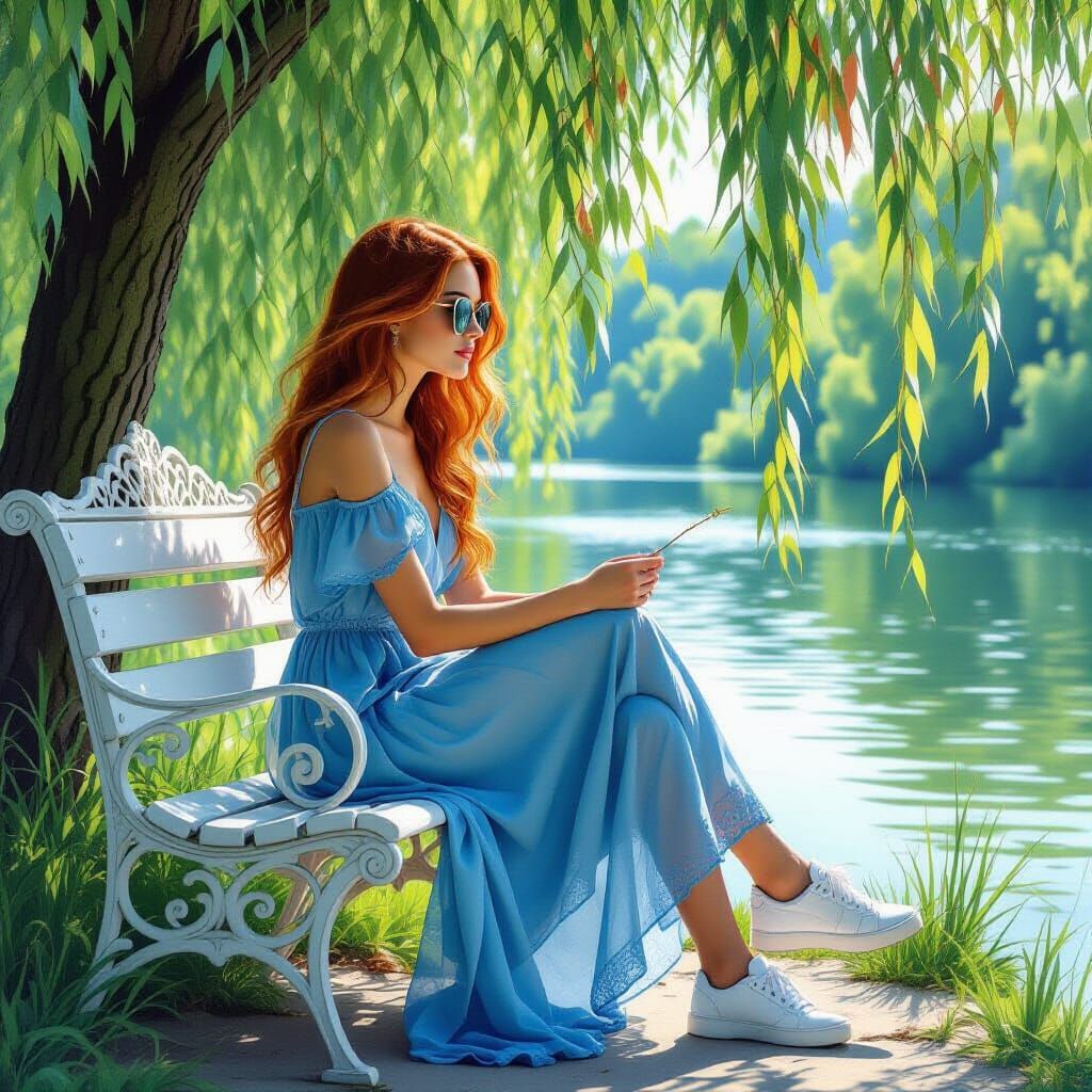 This image shows a red-haired woman in a blue dress sitting on a bench by a river, looking at the water. Sunlight filters through willow leaves in this photorealistic image with textures resembling cardboard-embedded watercolor.