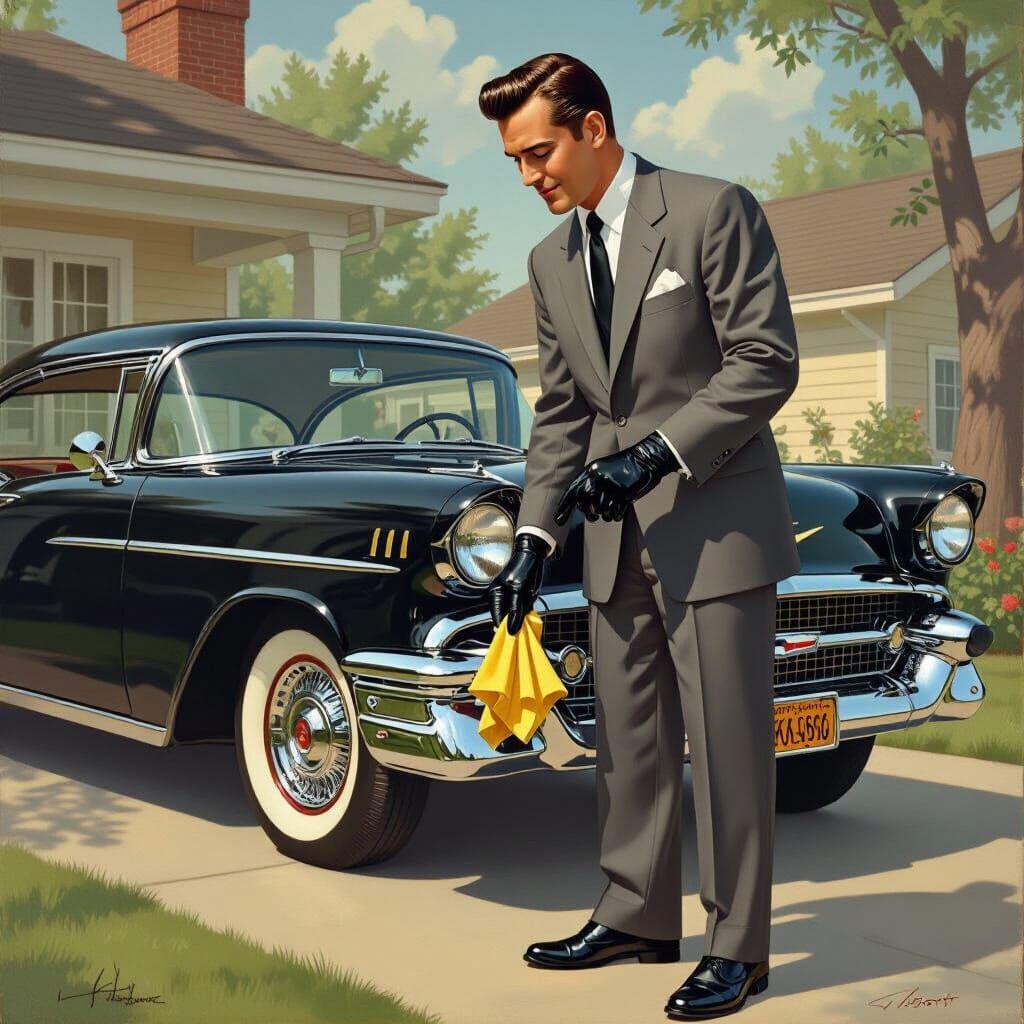 A man in a grey suit polishing a black Chevrolet. The image evokes a nostalgic mid-century American scene with realistic and futuristic elements.