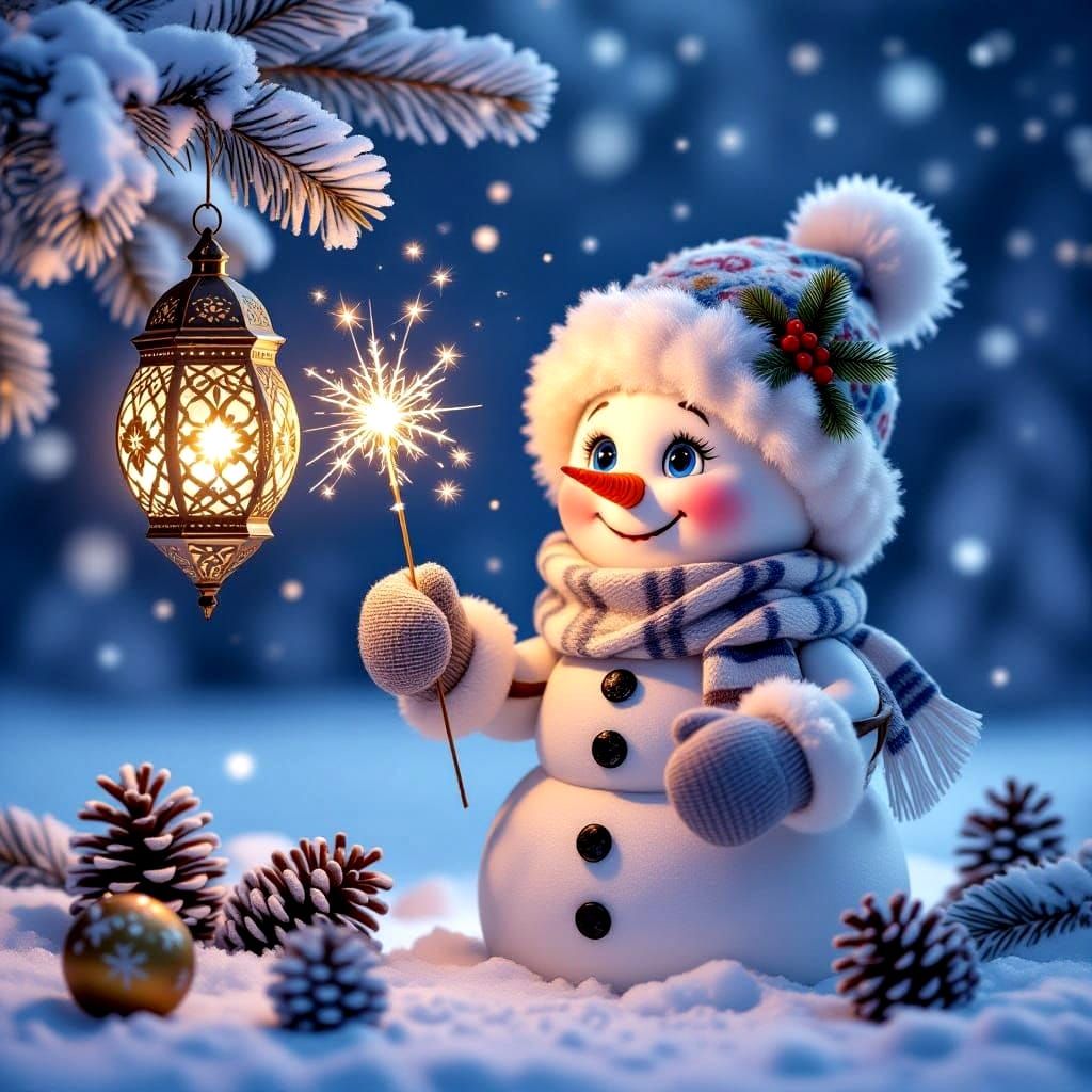 A photorealistic image of a friendly snowman holding a sparkler, reaching to light a decorative lantern on a snowy branch. Features pine cones, ornaments, and falling snowflakes.