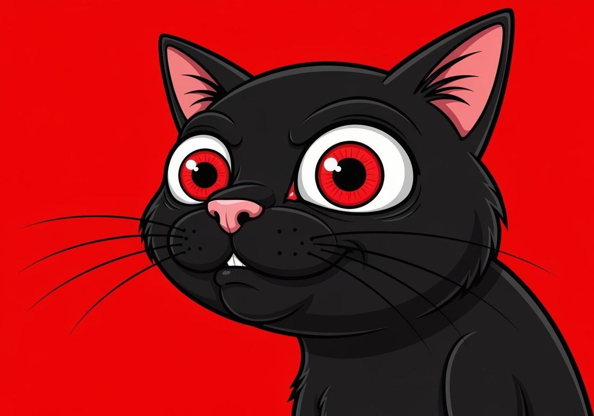 This image shows a black cat with striking red eyes against a red background, created in a cartoon style. The illustration features bold lines and exaggerated features to emphasize the cat's playful, mischievous expression.