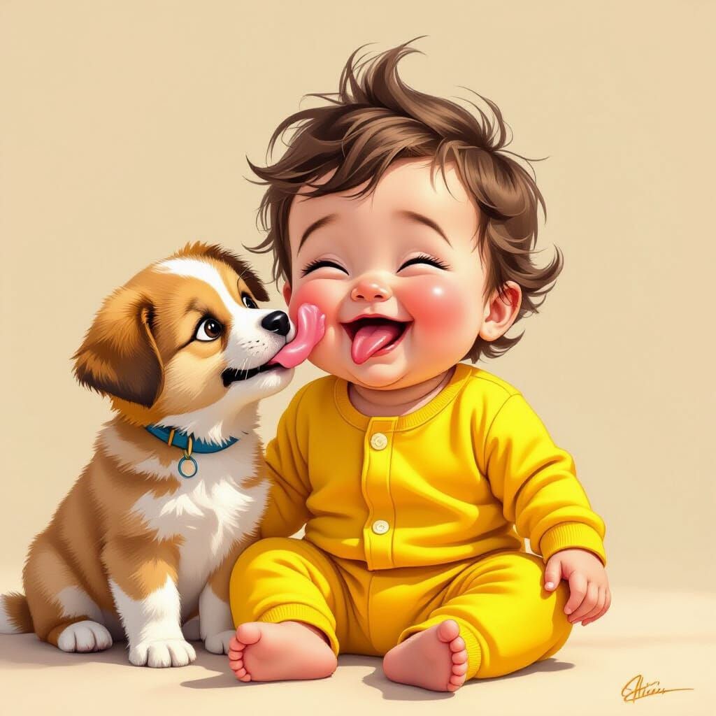 This image shows a baby laughing as a puppy licks his face. Rendered with hyper-realistic detail and soft, vibrant colors, the style evokes modern 3D animation.