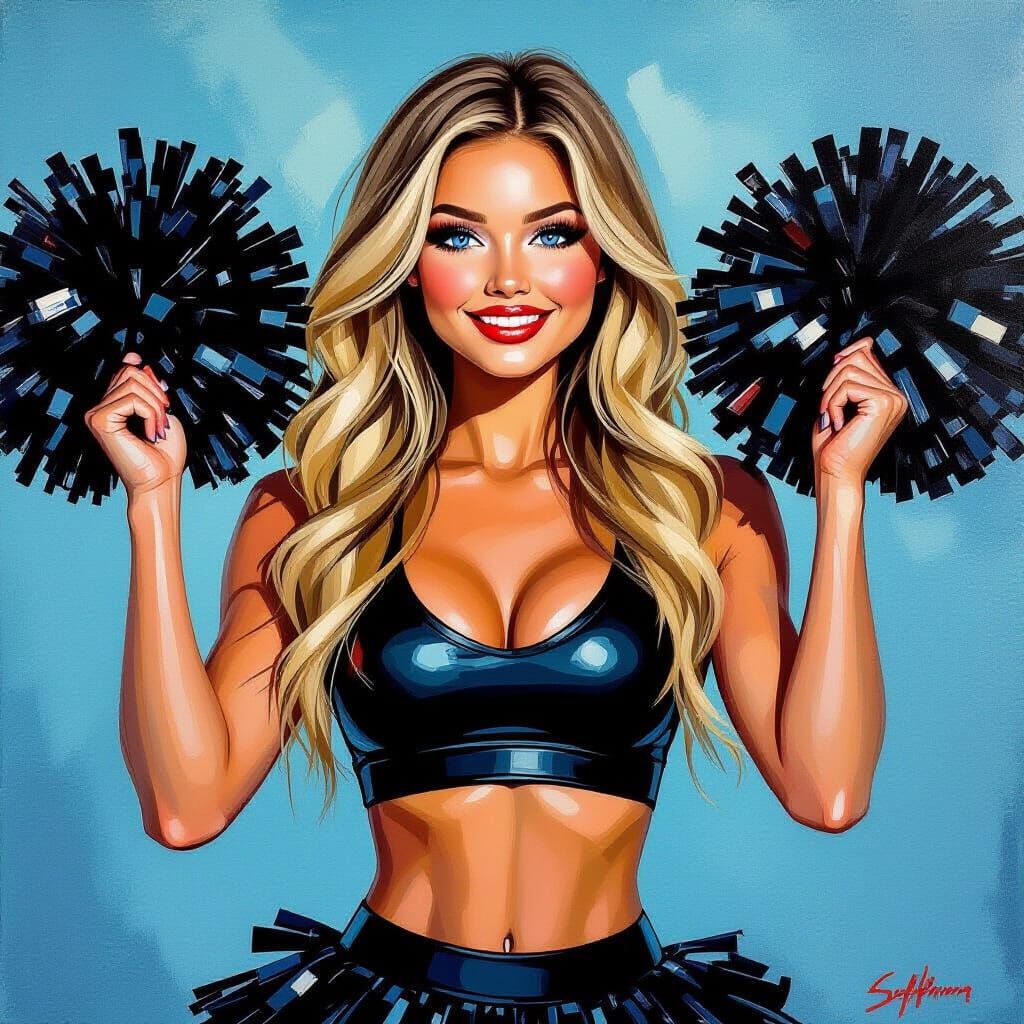 This image shows a vibrant and sassy cheerleader with blonde hair and blue eyes, holding black pom poms. The artwork is rendered in an expressive oil painting style with vivid colors and bold brushstrokes.