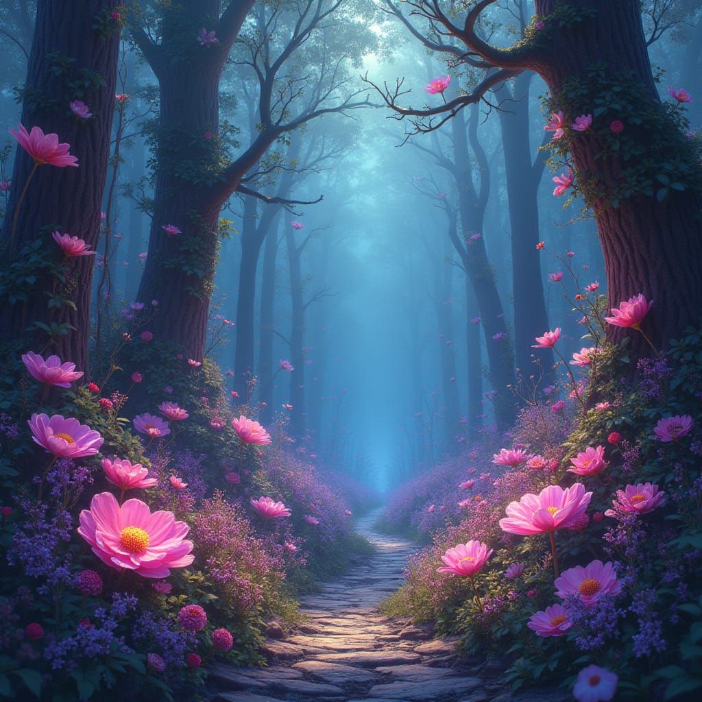 This image depicts a mystical, iridescent forest teeming with vibrant flora and fauna, blending fantasy and nature in a mesmerizing, dreamlike style.