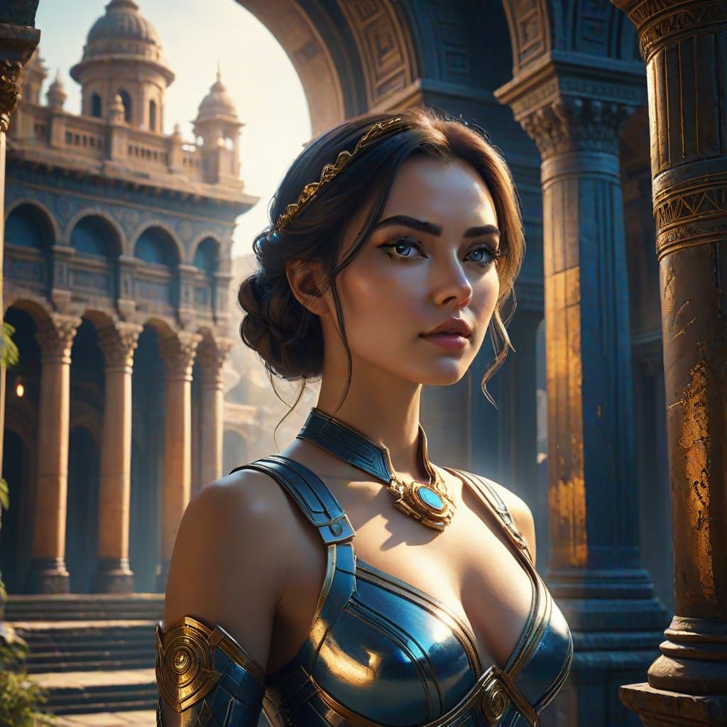 This image captures a young woman with striking features and shimmering eyes, set amidst a richly detailed backdrop blending ancient ruins, futuristic tech, and lush natural environments, with cinematic lighting and intricate magical elements.