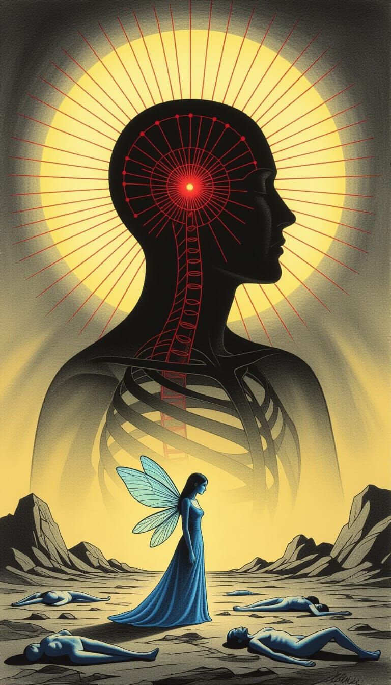 This mystical image features a large, glowing silhouetted head with radiating lines, a spinal energy diagram, and a small winged figure. Ethereal humanoids rest in a desolate landscape, evoking a dreamlike atmosphere.