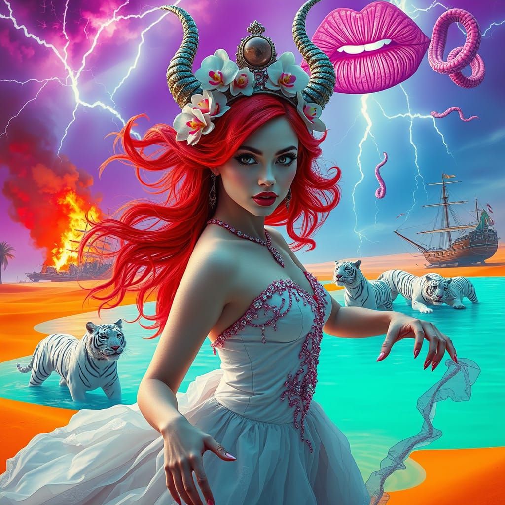 A surreal image of a woman with red and pink hair, lavender skin, and silver horns, dancing near a turquoise pool. The artwork features dramatic lighting and a vibrant, color-graded aesthetic.