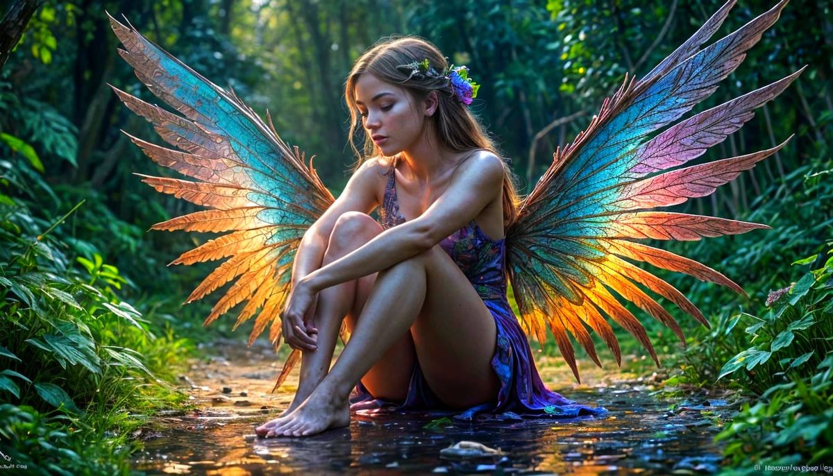 This hyperrealistic image features a detailed fairy with vibrant, ethereal wings, sitting with her knees hugged. The artwork showcases dramatic lighting and a colorful background, evoking concept art.