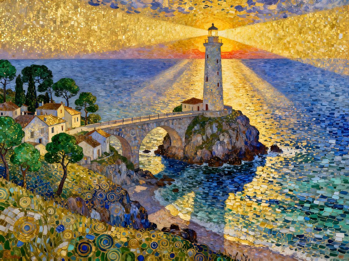 This AI-generated artwork depicts a serene village with a lighthouse and bridge, bathed in warm sunlight. The style evokes the decorative patterns and golden hues characteristic of Gustav Klimt's work.