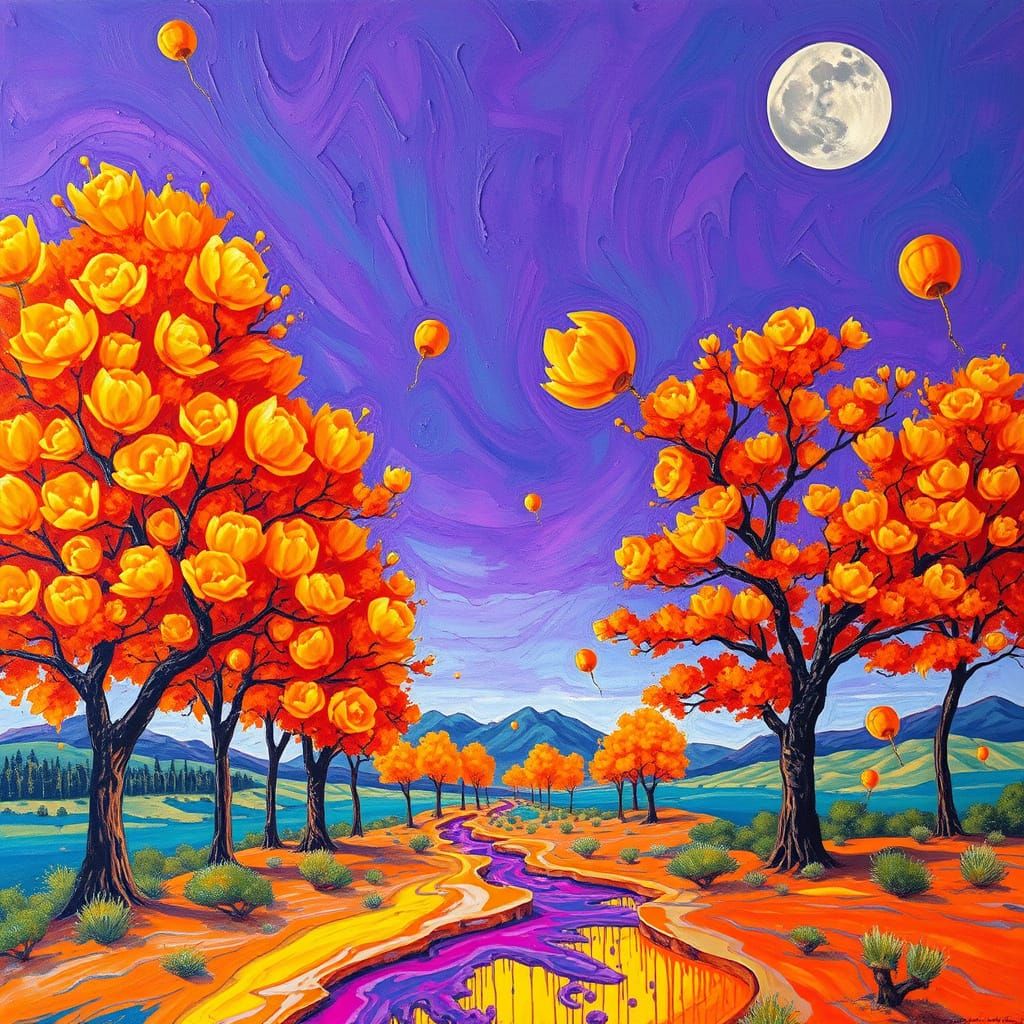 A surreal landscape painting with violet skies and blooming orange trees, created in a hyperdetailed charcoal drawing style with bold brushstrokes and vibrant colors, blending mediums for a high contrast, polychromatic effect
