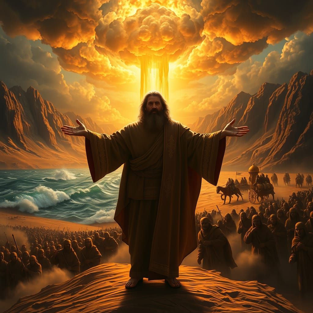 This dramatic painting depicts Moses standing heroically before the parting Red Sea, surrounded by towering mountains, a divine pillar of fire, and a sea of anxious Israelites, as Egyptian chariots approach in the distance, set against a stormy, apocalyptic sky with fiery hues.