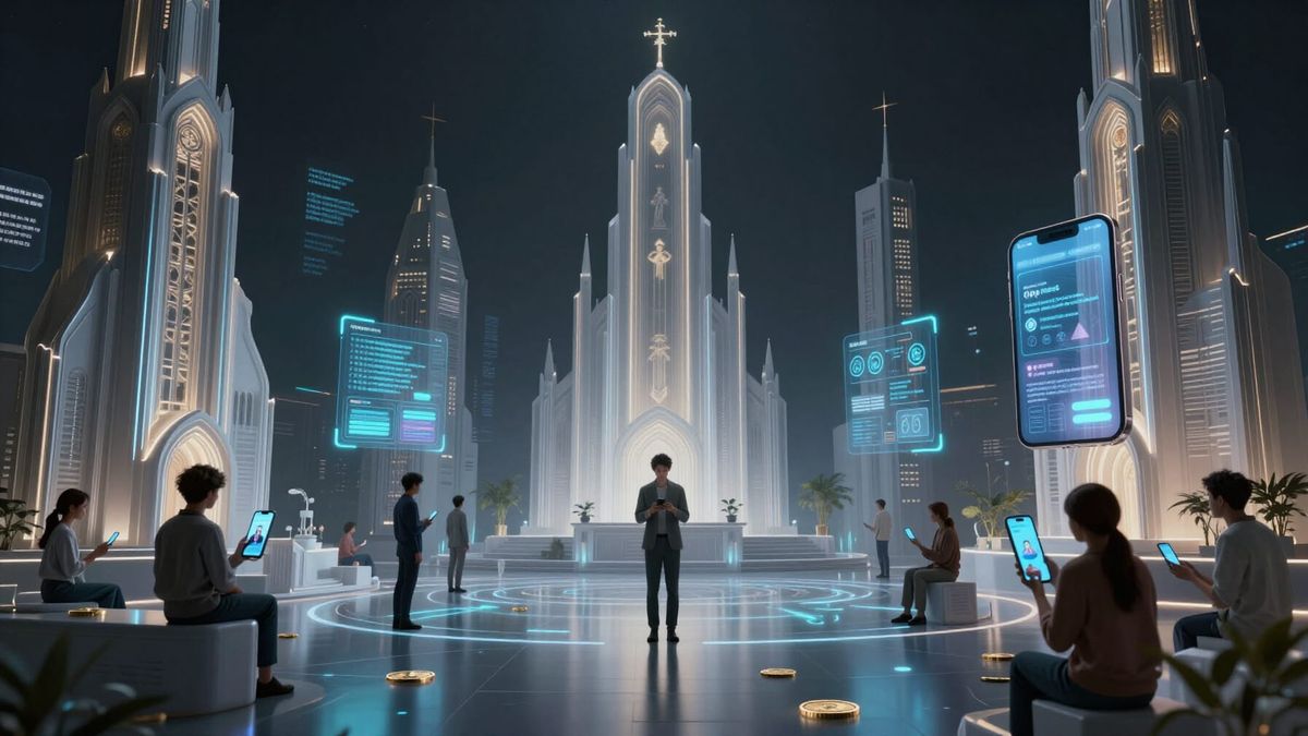 Cinematic concept art of a dystopian future where megachurches use technology. Faith is digitized, sold as products and online rituals, with cold neon lighting and corporate minimalism.