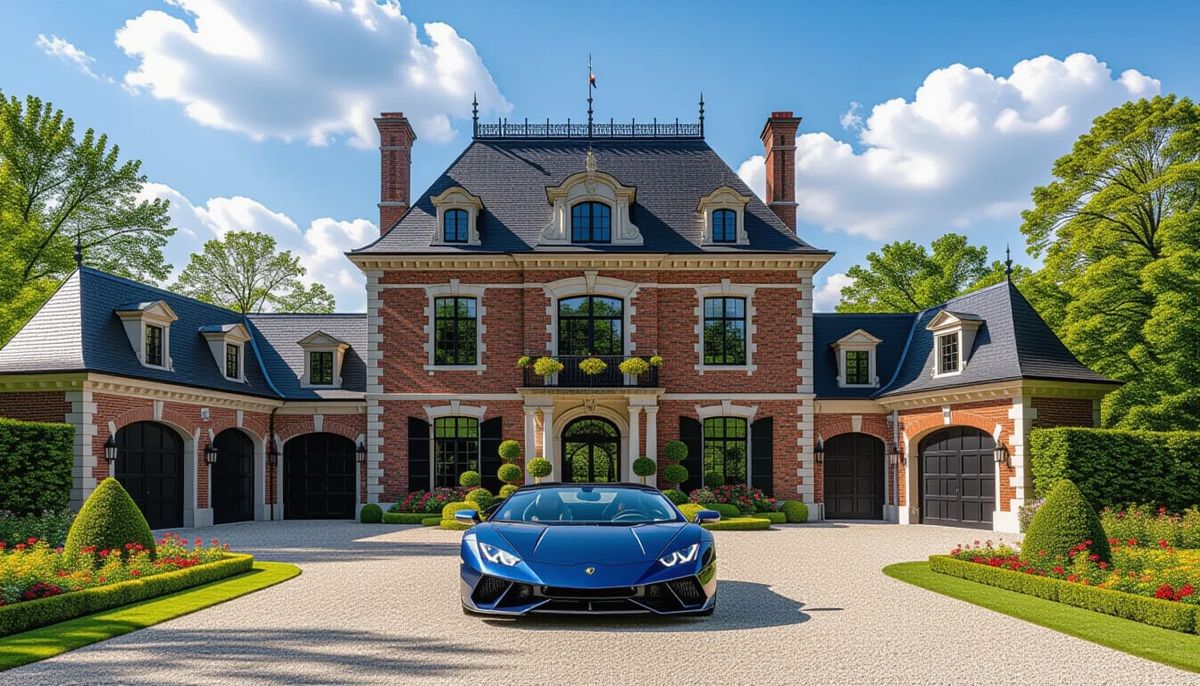 This image features a grand Victorian chateau with a navy Lamborghini, set against a backdrop of vibrant summer trees, a flower garden, and a blue sky. Rendered with painterly textures and rich hues.