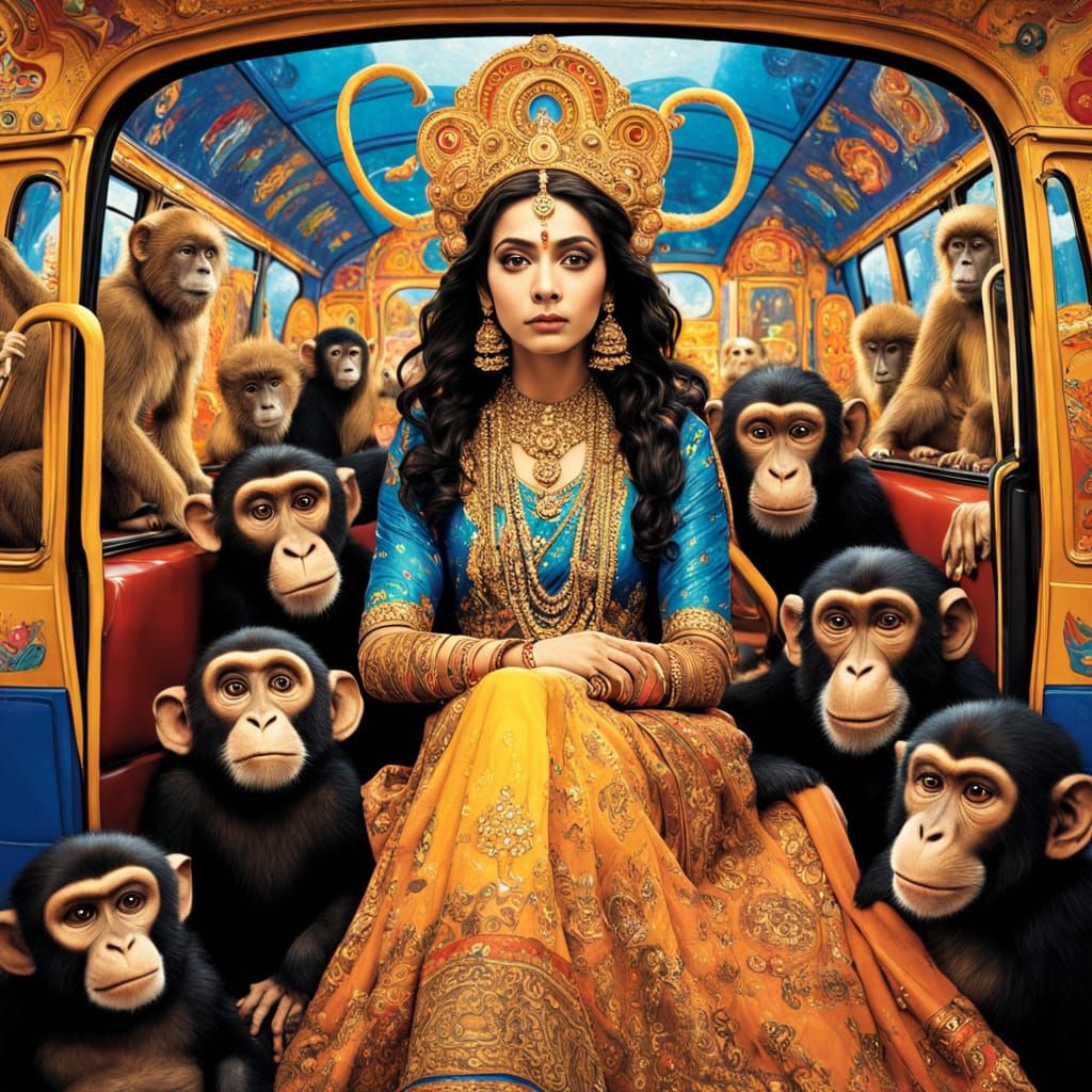 Create an impression of Venus SURYAVANSHIRA SINGHTA as a Lucknow monkey Queen sitting on her Suryavanshira bus line enroute to log castle. In the bus cabin she's sitting on her high chair in her McDonald's happy meal Tiara, on her bus ride of her life to be coronated in Lucknow, and to attend the Mc Donald's birthday party on the main corner of Lucknow. Several Mumbai celebraties would be at the event including Krusty, Bart, Homer, Marge and iconic cartoons too of Ren & Stimpy. Thus would be auspicious occasion fitting of such a title.