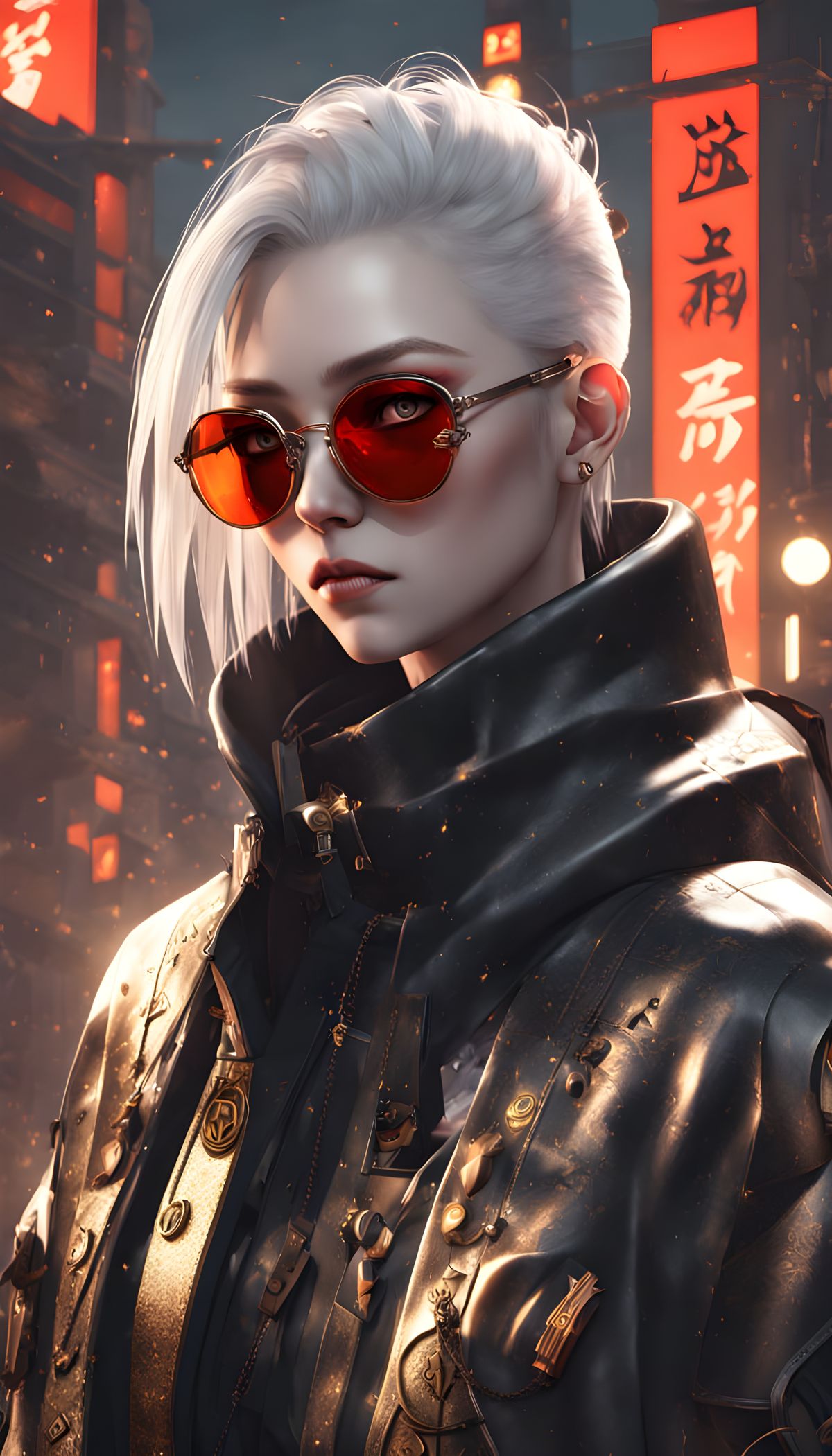 A hyperrealistic anime-style portrait of a confident woman with white hair and red eyes. She wears red glasses and a black jacket with Japanese text, in a dramatic, cyberpunk aesthetic with vivid red background.