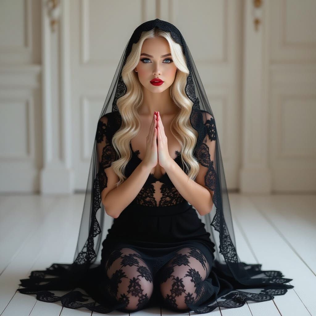 This image shows a blonde woman kneeling in prayer, wearing a lace dress and veil. The artwork blends Gothic and Art Nouveau elements, reminiscent of styles with intricate details.