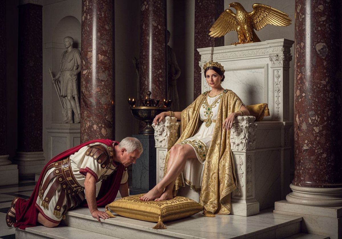 This image depicts Empress Messalina on a marble throne, with a Roman senator kneeling before her. The scene is richly detailed with gold accents and captured with sharp focus, reminiscent of high-end photography.