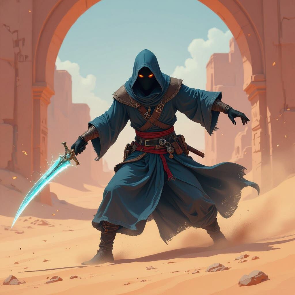 A gaunt thief detective dodges a pirate's scimitar in a sandstorm. This striking image features coral arches and a desert-edged jungle in a pre-islamic noir aesthetic.