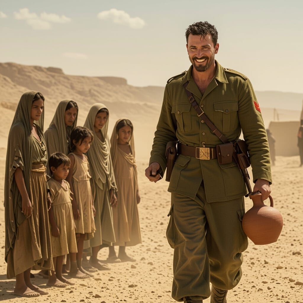 This image depicts a soldier with a cruel smile carrying water towards desperate prisoners in a barren desert. The scene evokes dramatic cinematic lighting and a gritty, realistic style.