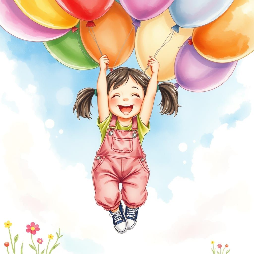 A charming image of a joyful girl with pigtails holding pastel balloons as she floats in the air. This watercolor fantasy scene is reminiscent of Beatrix Potter and Hayao Miyazaki's dreamy landscapes.