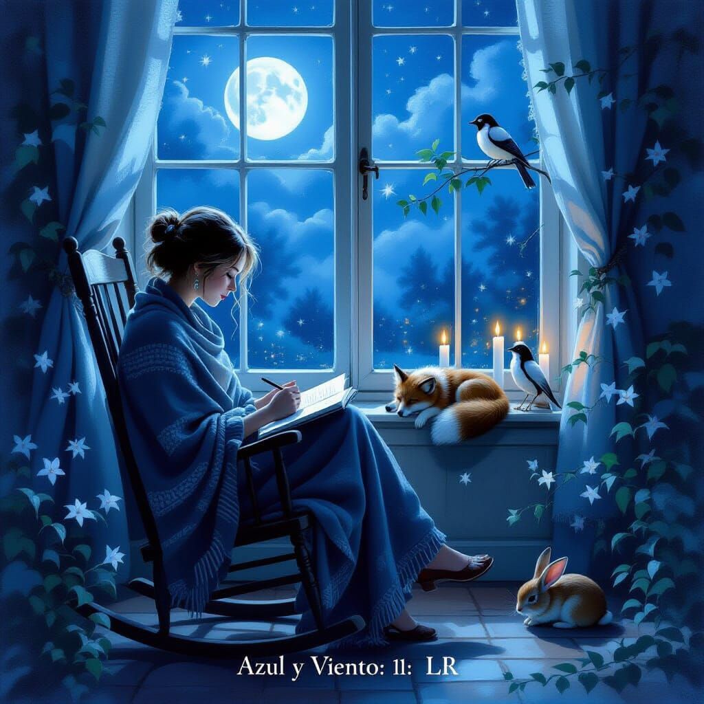 Una escena nocturna apacible bajo la luna llena. Lili, envuelta en un suave chal, escribe una carta a la luz de las velas, sentada en su mecedora. Piwi, su pinscher miniatura, duerme a su lado con una pata sobre su cuaderno.