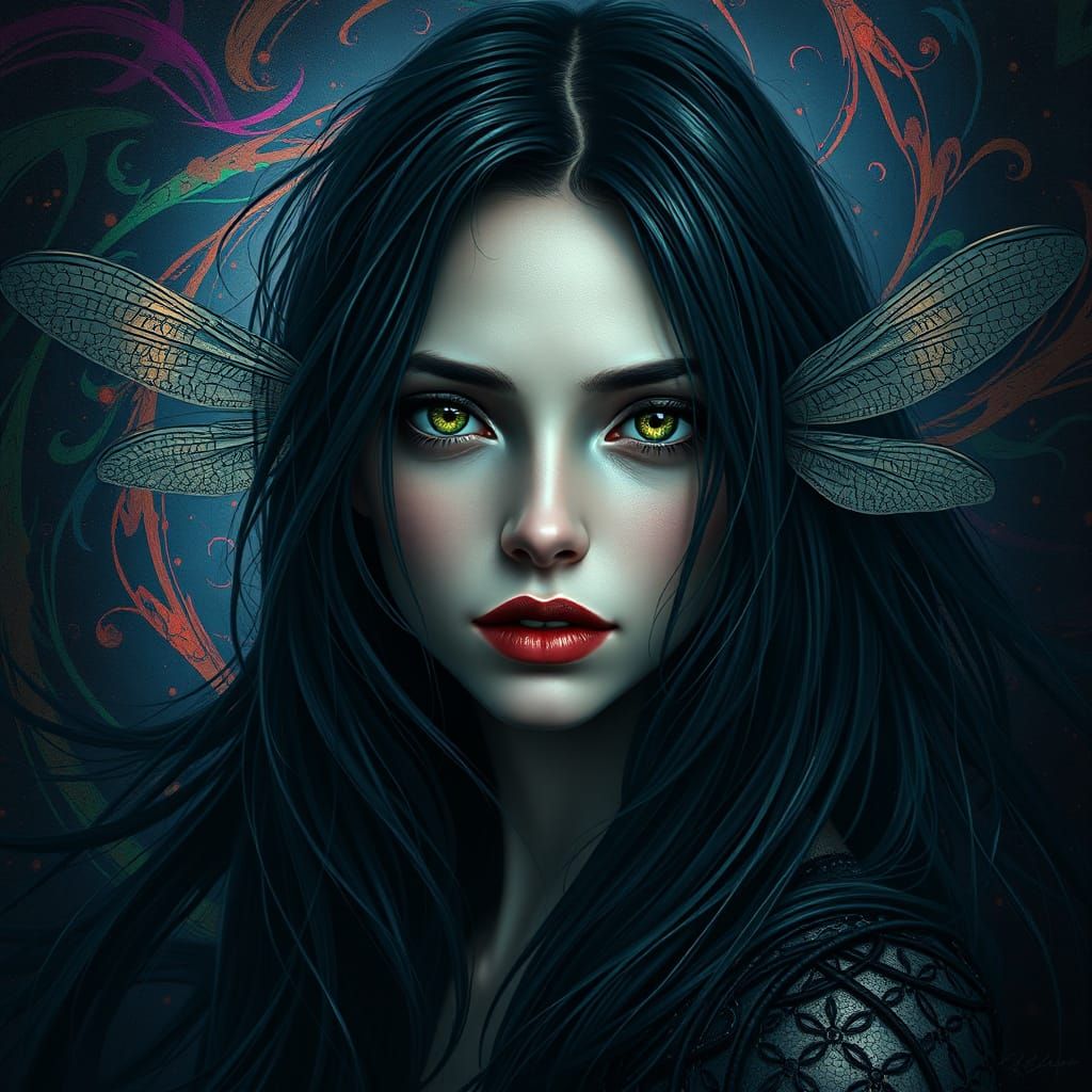A digital portrait of a sad, beautiful woman with green eyes and dark hair, enhanced with dragonfly wings, dark lipstick, and a swirling, colorful background. High resolution digital art with dynamic lighting.