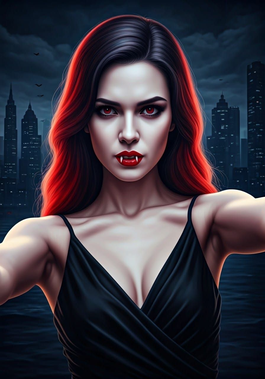 This image depicts a modern vampire woman posing in a dark, misty cityscape at night, with bold, high-contrast lighting and dramatic shadows, evoking a sense of mystery and elegance