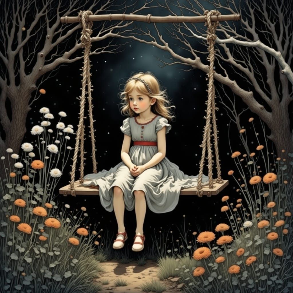A quaint image of a girl on a swing in a backyard garden. The artwork evokes a vintage, nostalgic aesthetic with elements of fantasy art.
