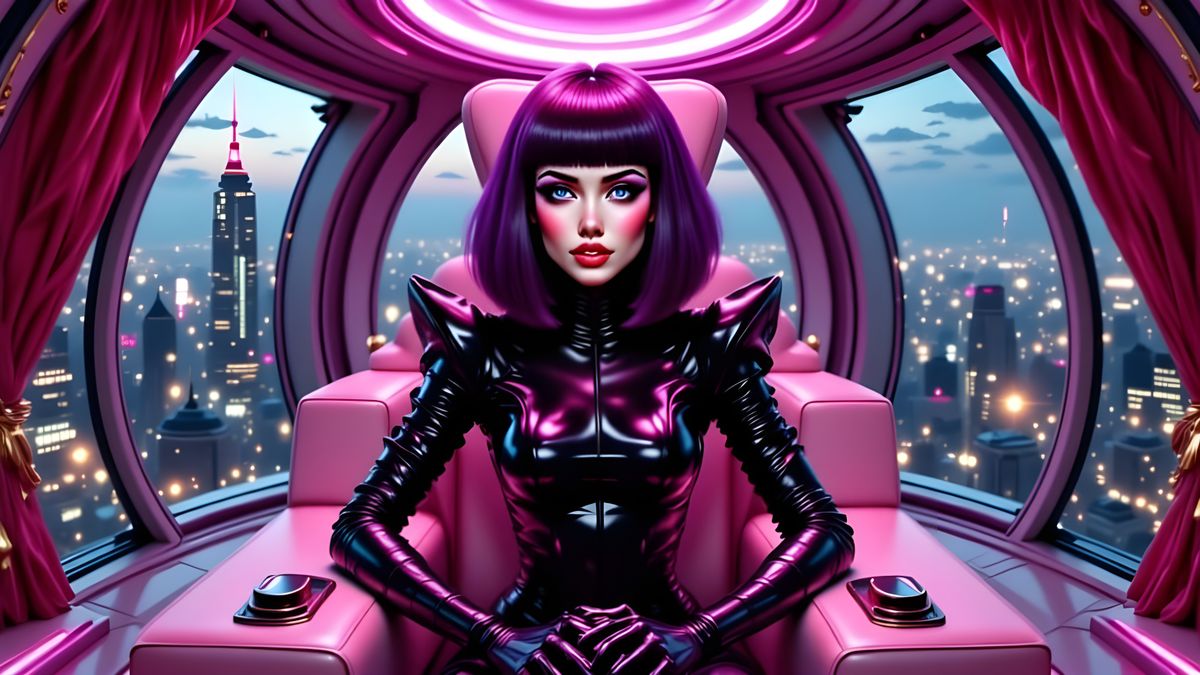 This image shows a muscular cyberpunk queen regally seated on a throne. The penthouse suite and vibrant outfit capture a futuristic aesthetic as 3d rendered digital art with photorealistic rendering.