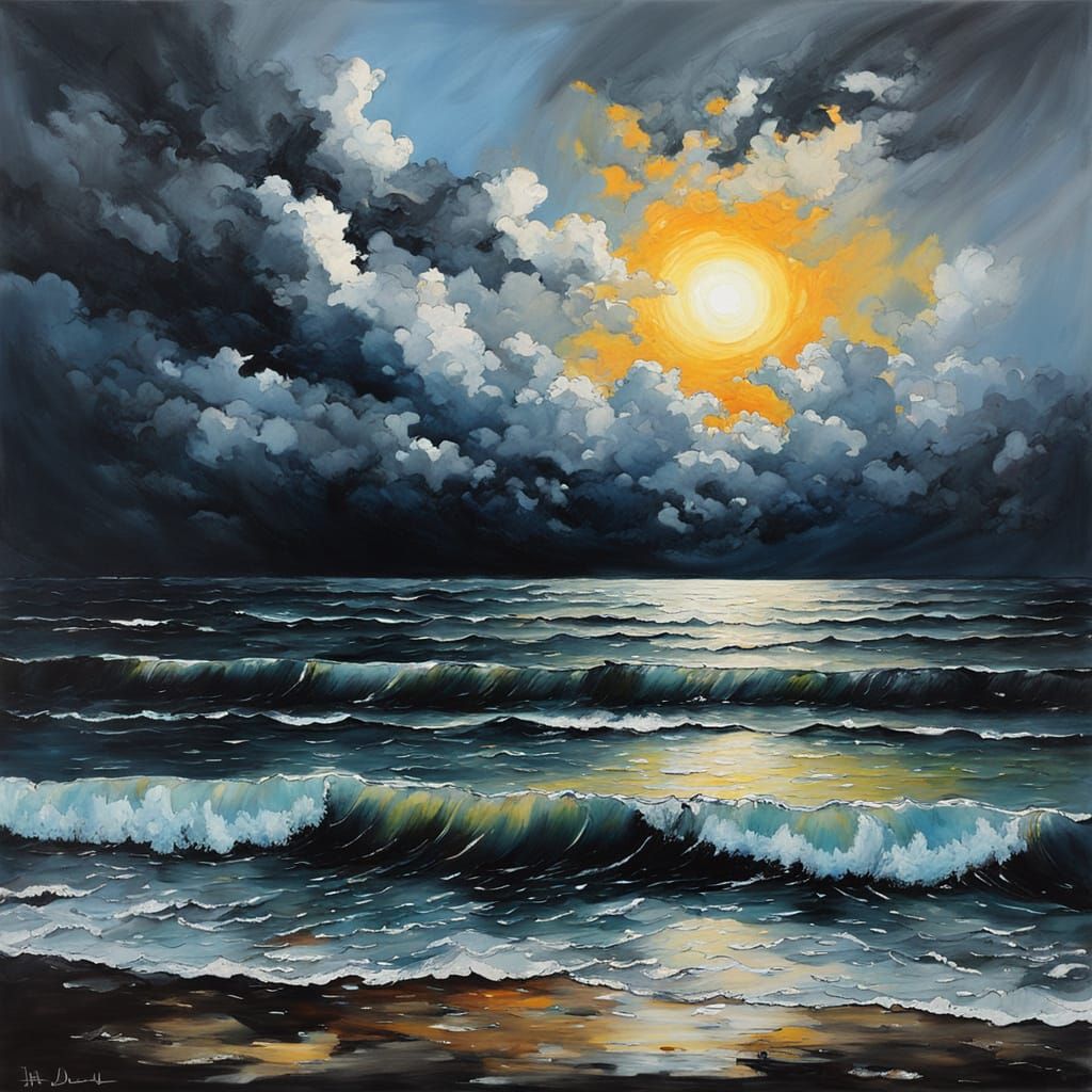 A dramatic painting of a cityscape at dusk, with storm clouds and a massive wave emerging from the ocean. Created in abstract art style with fine details and complementary colors.