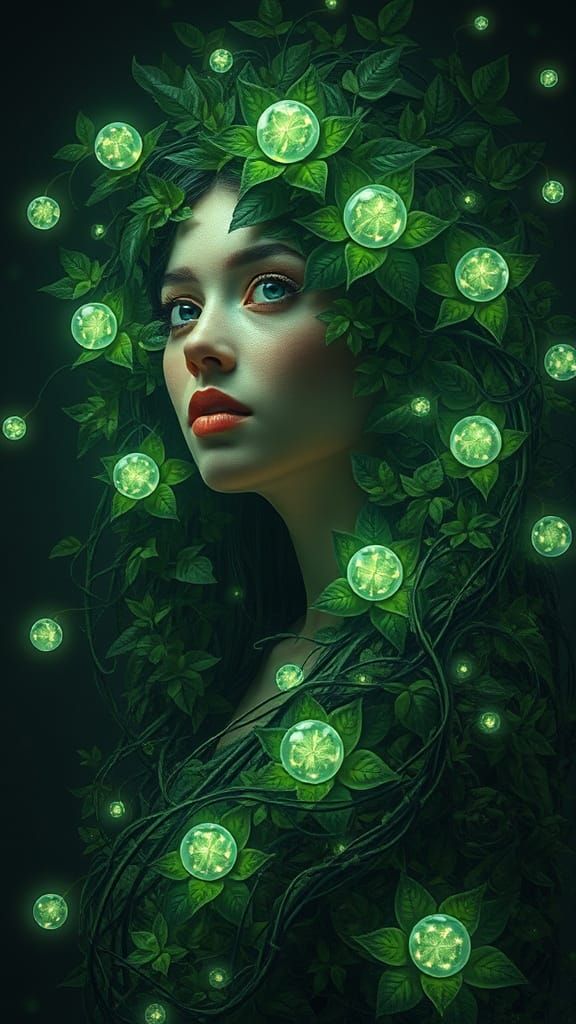 This image shows a surreal woman composed of leaves and vines, with glowing orbs and lights, in a hyperdetailed and dreamlike style.