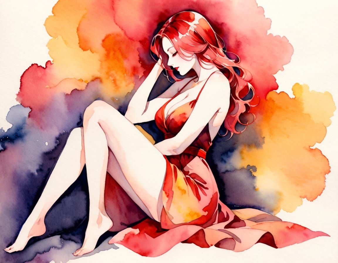A striking image of a red-haired woman in an abstract fashion sketch. The full body portrait features chiaroscuro art with warm colors and a dreamy, ethereal aesthetic.