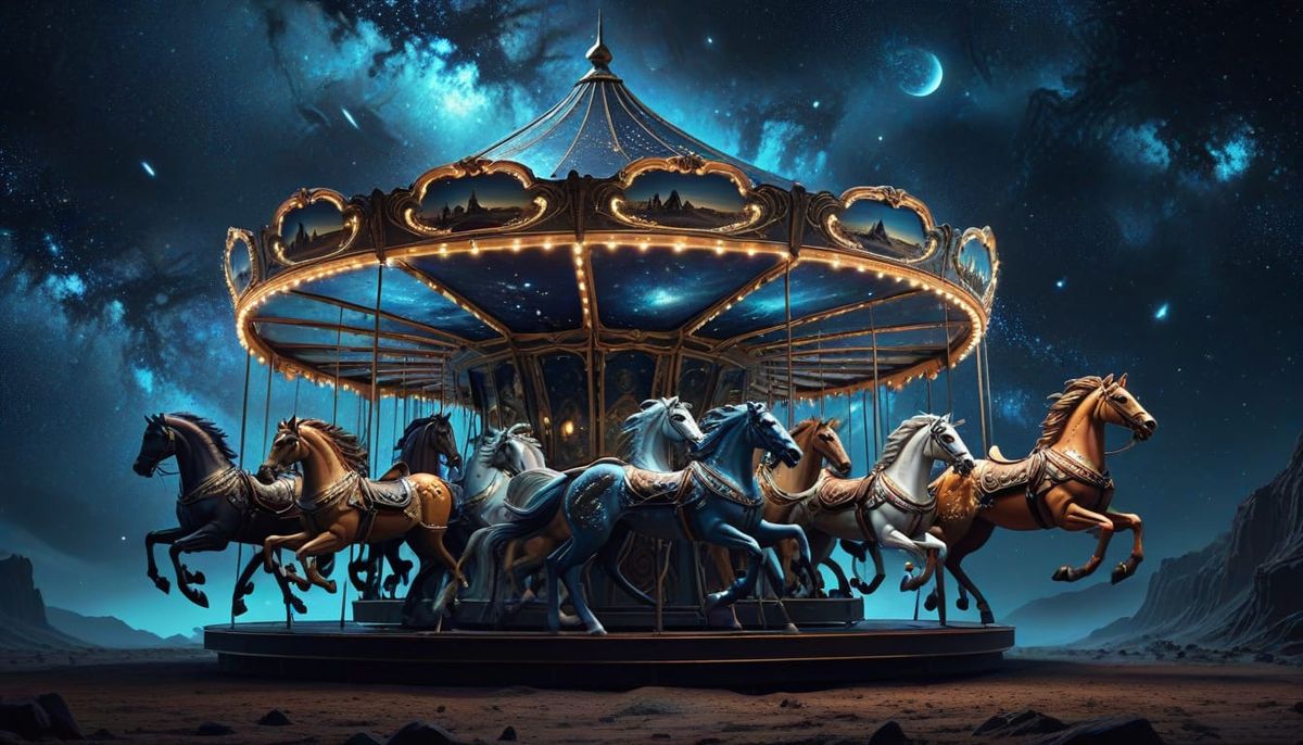 A hyperrealistic digital painting capturing a vintage carousel at midnight, its horses mid-gallop against a vast, nebulae-filled cosmic sky. Features dramatic moonlit lighting and vivid colors.