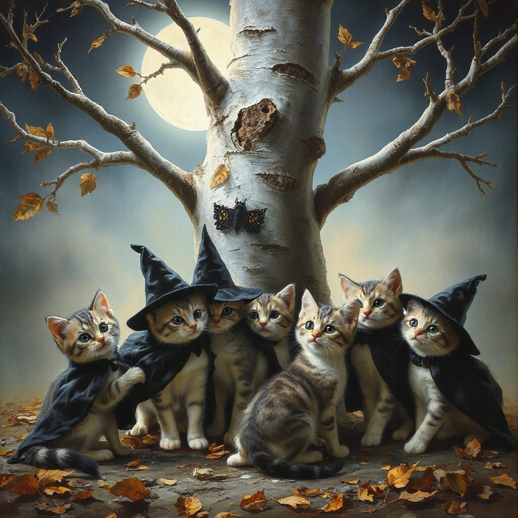 This enchanting oil painting captures a whimsical scene of kittens in a joyful circle around a majestic silver birch tree, set against a vibrant autumn atmosphere, with dramatic chiaroscuro lighting and rich textures, reminiscent of mystical landscapes and fantastical illustrations.