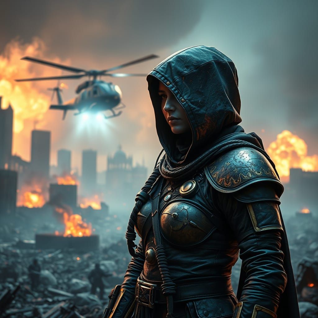 This image shows a queen in leather armor amid city ruins, with a helicopter overhead. Features explosions, neon lights, and survival gear in a cinematic, high-contrast style.