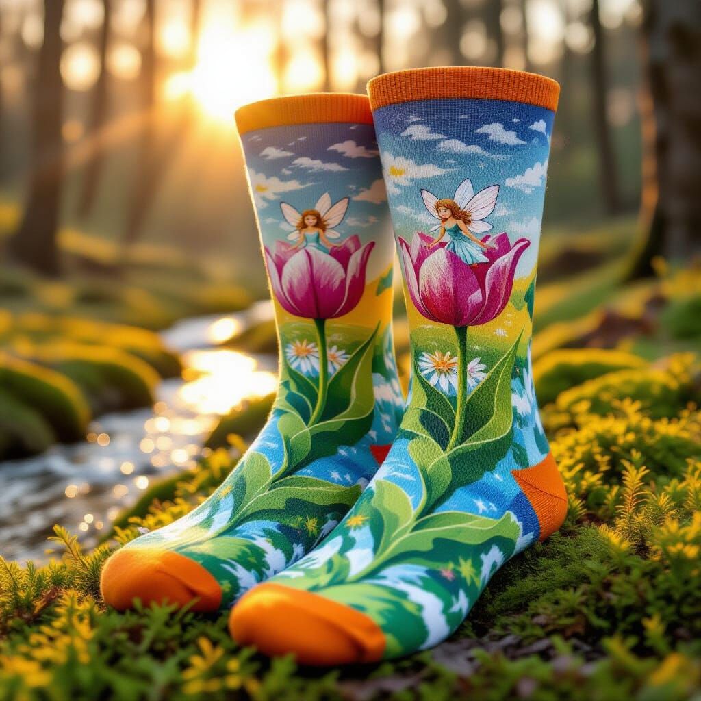 This image shows a pair of 3D designed socks featuring a fairytale landscape. Cute fairies are depicted inside a giant dew-filled tulip next to a creek, with moss and wool textures at sunrise. Showcases abstract art with complementary colors.