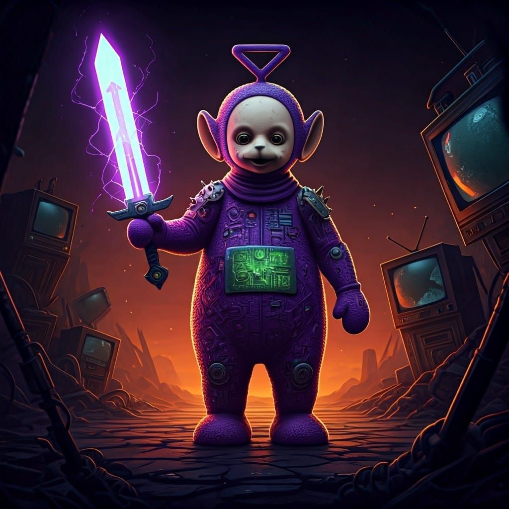 A menacing, cybernetic Teletubby stands amidst shattered TV screens and twisted wreckage, its face twisted in a grotesque grin, as it wields a glowing sword in a desolate, dystopian landscape.