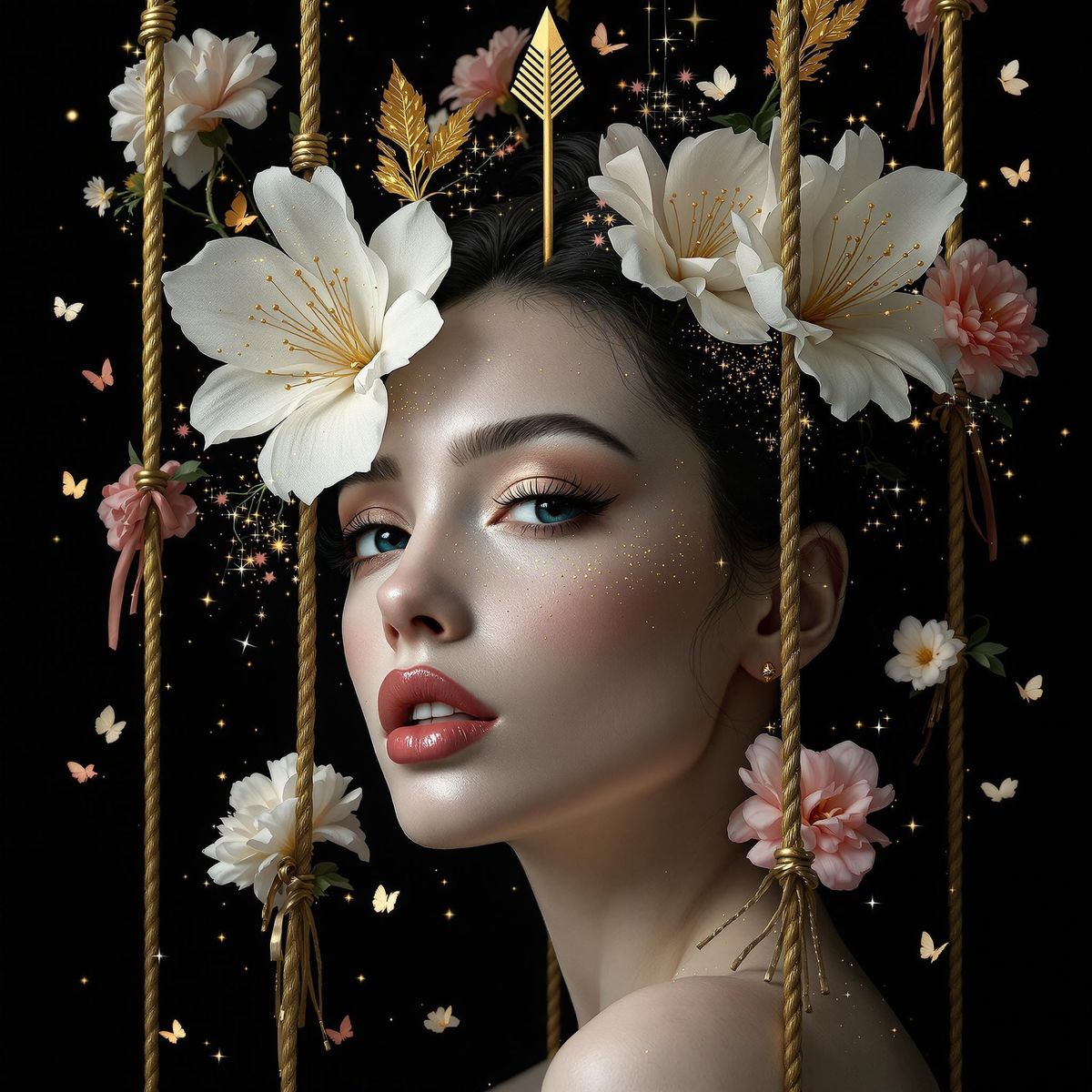 A surreal, digital artwork of an elegant woman with flowers and glitter, suspended on two golden ropes against a black background, adorned by small butterflies and sparkles. The woman has pale skin, large, dark eyes, long eyelashes, and is wearing glossy lipstick. Her hair features three flower shaped ...