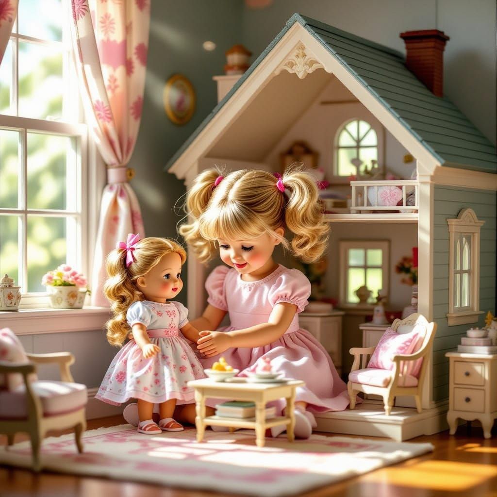 This image shows a happy young girl with blonde pigtails in a pink dress, playing with an American Girl doll in a richly furnished dollhouse. The scene is illuminated by warm sunlight, rendered in a vibrant, storybook illustration style.