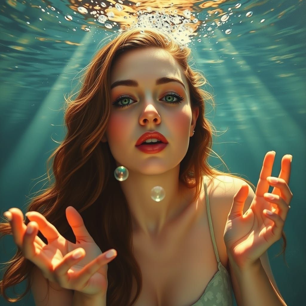A serene woman swims underwater, bathed in sunlight. Her long brown hair flows around her as she blows bubbles. This artwork evokes idealized naturalism with soft edges and harmonious colors reminiscent of vintage pin-up art.