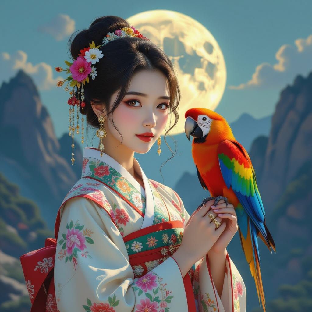 This image shows a beautiful young woman in traditional Korean attire, holding a colorful parrot. The digital painting combines realism and fantasy, with a dreamlike quality reminiscent of classical portraiture.