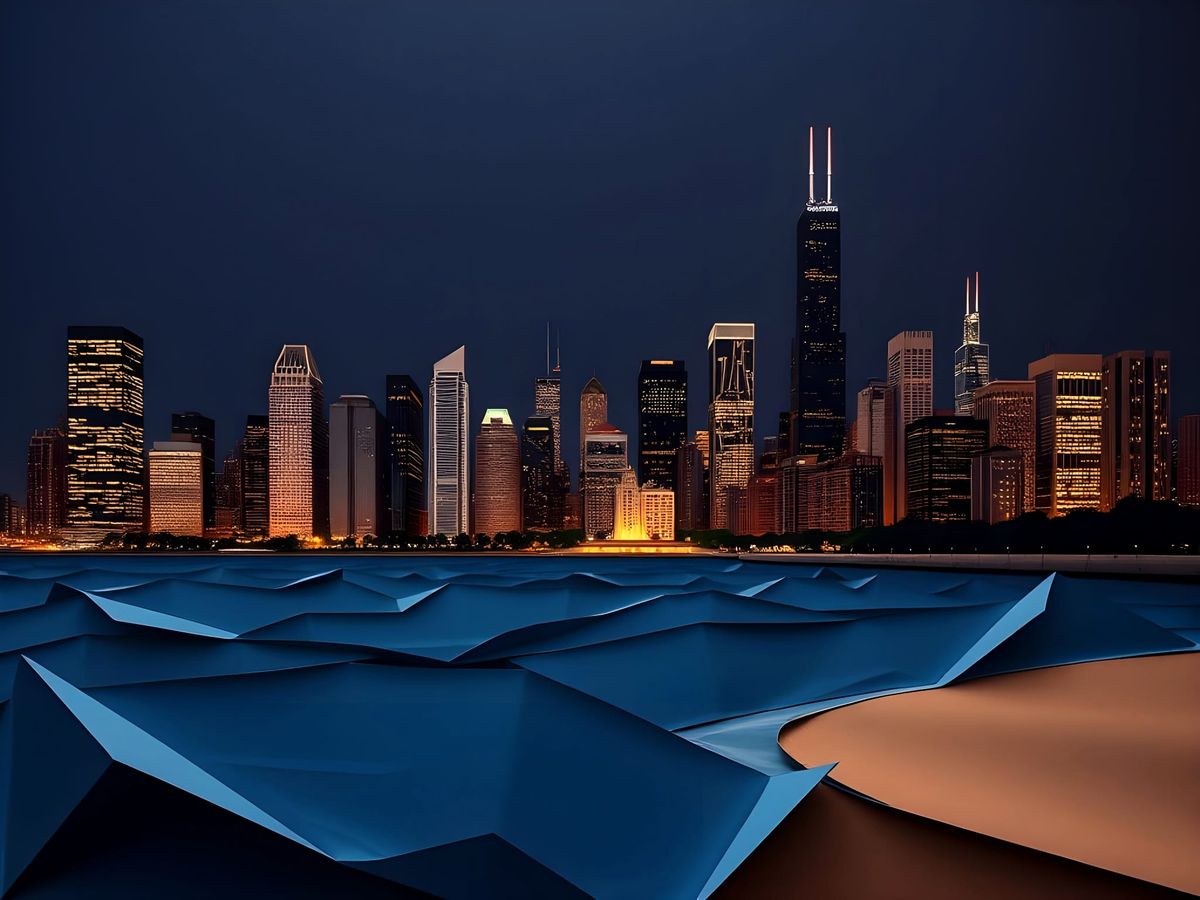 This image shows the Chicago skyline at night, reflected in Lake Michigan. The artwork is rendered in a paper origami style, giving a soft focus effect to the city lights.