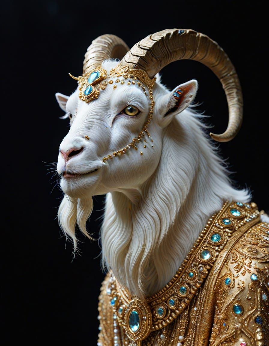 This image shows an AI-generated portrait of a goat god. The artwork has a glittering and grandiose design.