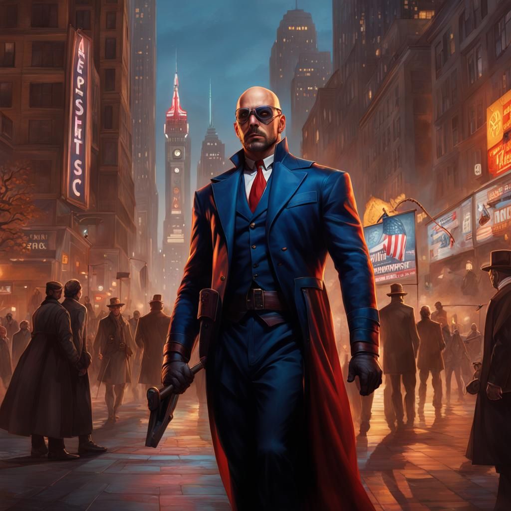 This image depicts a tall, bald man in a Captain America suit and Halloween mask standing on Stark Tower. The digital art features dynamic lighting, intricate details, and triadic colors.