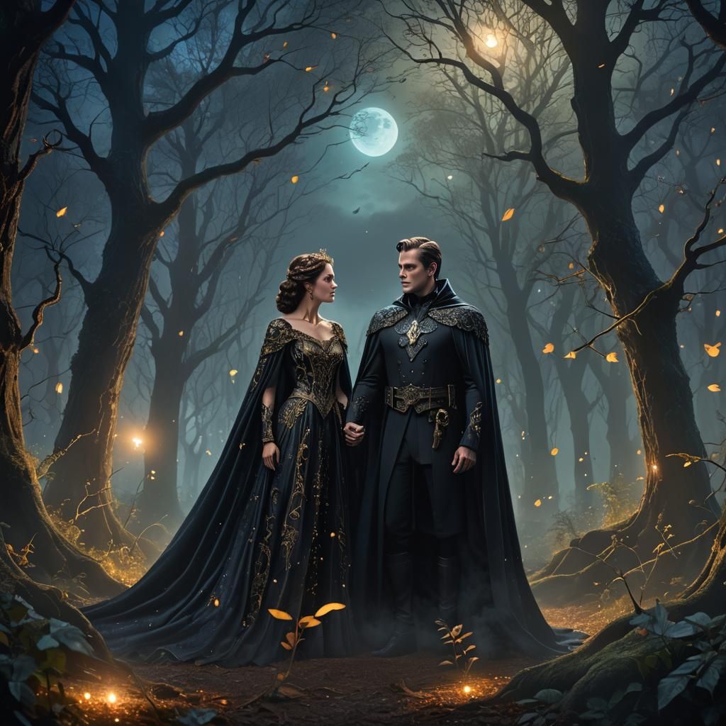 A captivating image of the Phantom of the Night and her wife in a mystical forest. The fantasy concept art features cinematic lighting, rich colors, and intricate details in an Unreal Engine 5 style.
