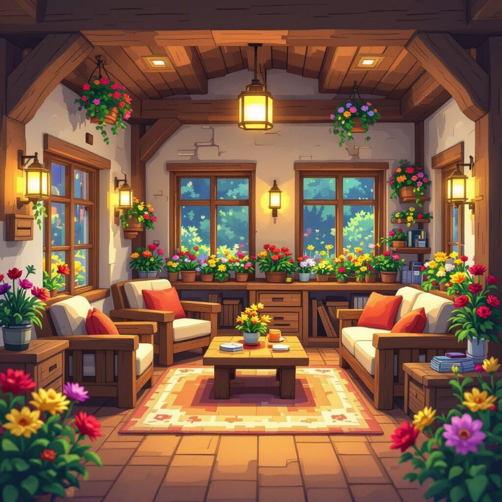 A vibrant Minecraft house interior featuring comfortable furniture, wooden tables, and colorful flower decorations. Warm lighting enhances the cozy, whimsical atmosphere as digital art.