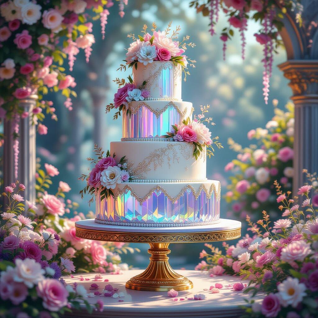 A digital rendering of a towering wedding cake made of shimmering crystal. Luminescent flowers surround the cake, set in soft pastel hues with ethereal lighting, in a surrealist aesthetic.